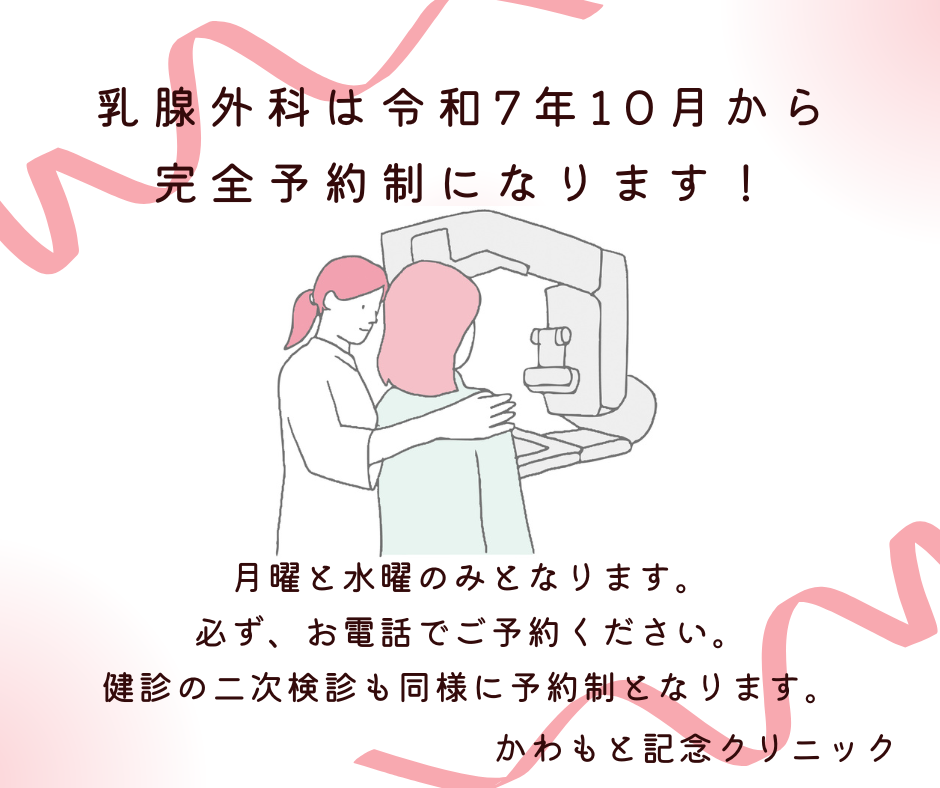 乳腺外科は、令和7年10月より完全予約制となります。 月曜と水曜のみとなります。 必ず、お電話でご予約ください。 健診の二次検診も同様に予約制となります。
