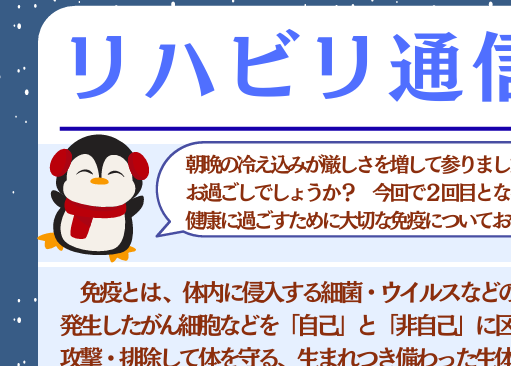 リハビリ通信Vol.2 2026年冬号を発行しました! 今回は、健康に過ごすために大切な免疫についてお伝えします。 リハビリ通信Vol.2_2026年冬号