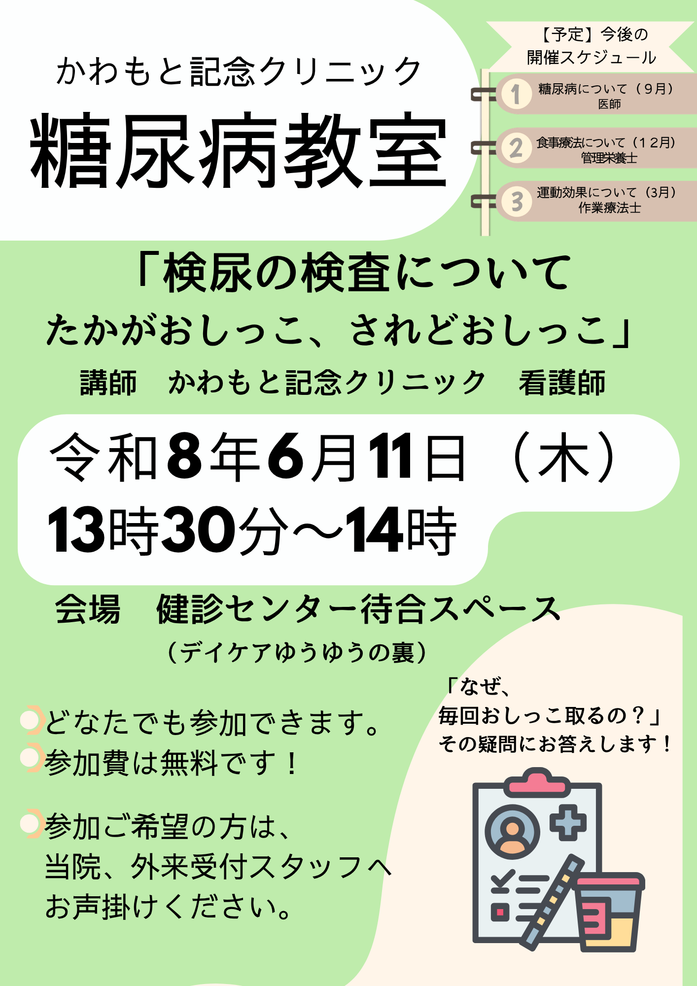 令和8年6月11日(木)13時30分から 当院の健診センター待合室において 「糖尿病教室」を開催します。 内容は、 検尿の検査について~たかがおしっこ、されどおしっこ です。 当院の看護師が講師を務めます。 どなたでも参 [ …続きを読む ]