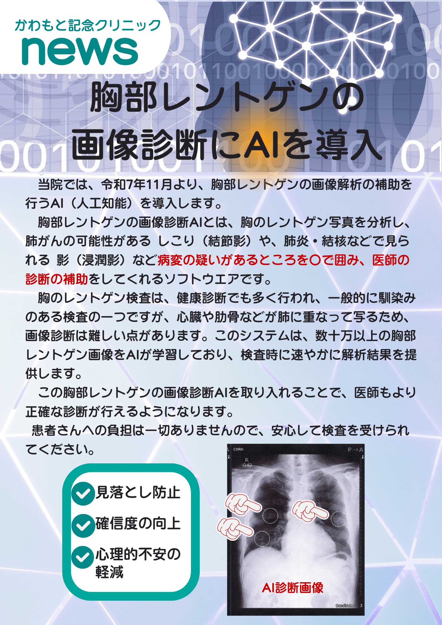 当院では、令和7年11月より、胸部レントゲンの画像解析の補助を行うAI(人工知能)を導入します。